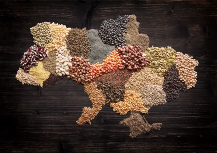 Key visual for Ukraine’s largest seed producer: a map of the country composed entirely of seeds, with each region represented by its characteristic crop.
