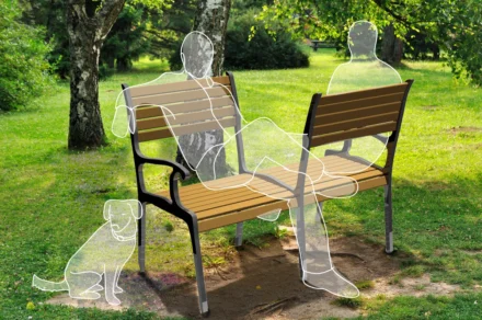 A bench for Kyiv’s Central Park that revives a centuries-old tradition of crafting “kissing benches” — designed so people sit facing each other to talk, rather than side by side watching TV.